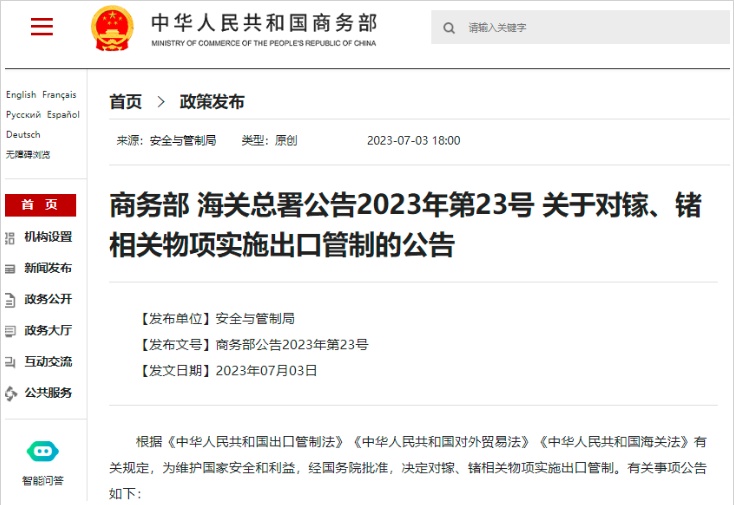 其中,鎵相關(guān)物項包含氮化鎵、砷化鎵、銦鎵砷等;鍺相關(guān)物項包含磷鍺鋅、鍺外延生長襯底、二氧化鍺等。該公告自2023年8月1日起正式實施。