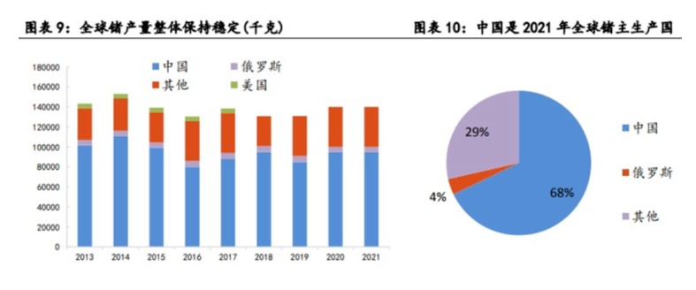 據(jù)USGS數(shù)據(jù),全球鍺資源中國占比41%,美國占比45%。2021年全球原生鍺產(chǎn)量約130噸,其中,中國、俄羅斯兩國的產(chǎn)量占全球的70%,中國是全球最大的鍺生產(chǎn)國,占比達(dá)68%,近十年來累計供應(yīng)全球68.5%的鍺。而美國雖然是全球最大的鍺資源儲量國,但自1984年以來,就將鍺作為國防儲備資源進(jìn)行保護,尤其是近幾年已基本不再進(jìn)行鍺的開采。