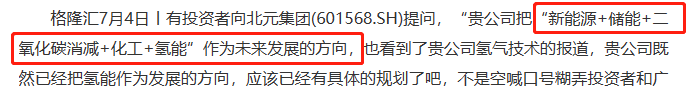 據(jù)北元集團(tuán)回復(fù)稱,2023年,公司將開展鹽穴儲(chǔ)能關(guān)鍵技術(shù)和納米碳酸鈣制備技術(shù)研究,加快推進(jìn)光伏發(fā)電+質(zhì)子膜電解水制氫技術(shù)研究,氣液法無汞工藝、高空風(fēng)能等項(xiàng)目研究應(yīng)用進(jìn)度,強(qiáng)化成果轉(zhuǎn)化,大力推進(jìn)萬噸級(jí)煤化工廢鹽回用電解試驗(yàn)裝置工藝包設(shè)計(jì),把“新能源+儲(chǔ)能+二氧化碳消減+化工+氫能”作為轉(zhuǎn)型升級(jí)新路徑,積極探索綠色發(fā)展的新型高質(zhì)量發(fā)展道路。