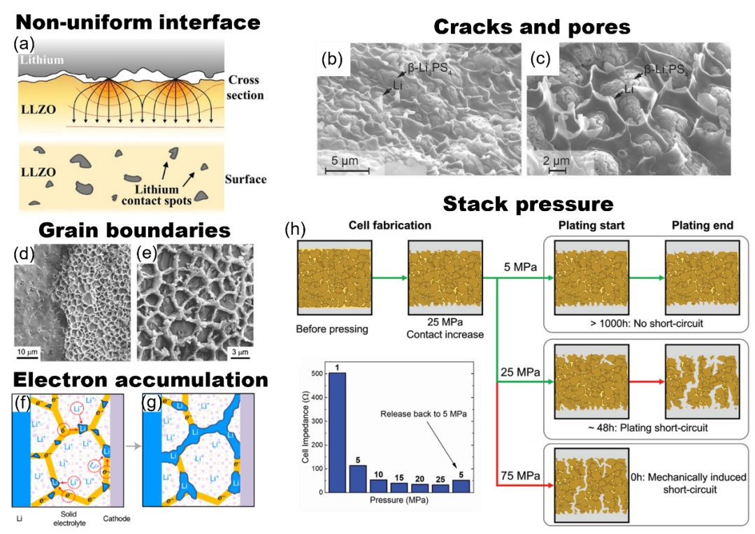 圖1.(a)SE和Li金屬之間的不均勻界面接觸導致熱點處的電場放大,從而引發(fā)Li枝晶生長;經(jīng)許可復制,版權(quán)所有2019,AmericanChemicalSociety。(b-c)斷裂的LPSSE表面的SEM圖像,顯示在SE聚集體之間的裂紋和孔隙處的Li枝晶生長;經(jīng)許可復制,版權(quán)所有2017,WILEY¬CHVerlagGmbH&Co.KGaA,Weinheim(d-e)SEM圖像顯示了沿石榴石SE晶界的Li枝晶生長;經(jīng)許可復制,版權(quán)所有2016,ElsevierLtd。(f-g)示意圖表明,晶界處的小禁帶和電子積累導致鋰枝晶生長;經(jīng)許可復制,版權(quán)所有2021,Xiao ming Liu etal.under exclusive licence to Springer Nature Limited。(h)示意圖顯示了堆疊壓力對SE中鋰枝晶擴展和電池阻抗的影響。經(jīng)許可復制,版權(quán)所有2019,WILLEY¬CHVerlagGmbH&Co.KGaA,Weinheim