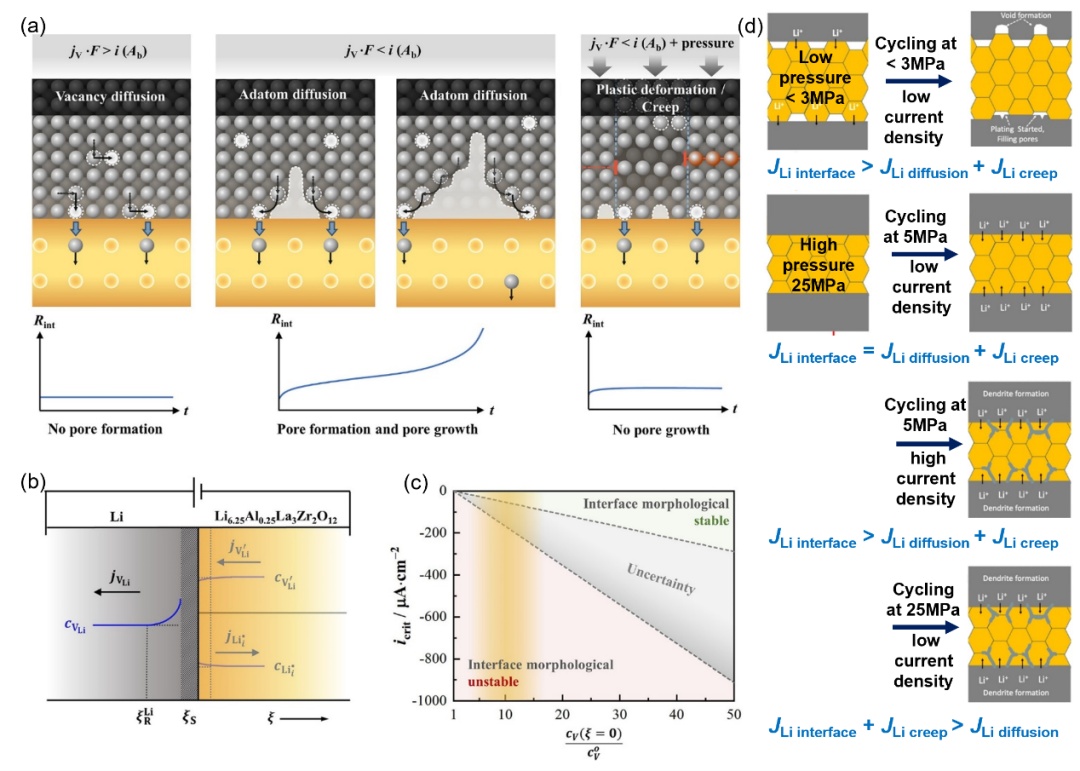 圖2.(a)示意圖顯示,如果剝離電流密度超過Li空位的擴散極限,則在Li/SE界面處形成空洞,外部壓力導致Li蠕變,從而阻止空洞形成;(b)顯示Li空位擴散的示意圖,在Li金屬中由Li空位濃度梯度控制;(c)CCD相對于SE/Li界面處的Li空位濃度與體相Li金屬中的平衡Li空位濃度之間的比率的變化;(a-c)經(jīng)許可復制,版權(quán)所有2019,AmericanChemicalSociety。(d)施加的壓力和電流密度影響電化學反應導致的界面Li離子遷移、Li蠕變導致的Li擴散和體相Li金屬中空位促進的Li擴散之間的關系,這決定了SE/Li界面處的空位和Li枝晶的形成。經(jīng)許可復制。[85]版權(quán)2020,AmericanChemicalSociety。