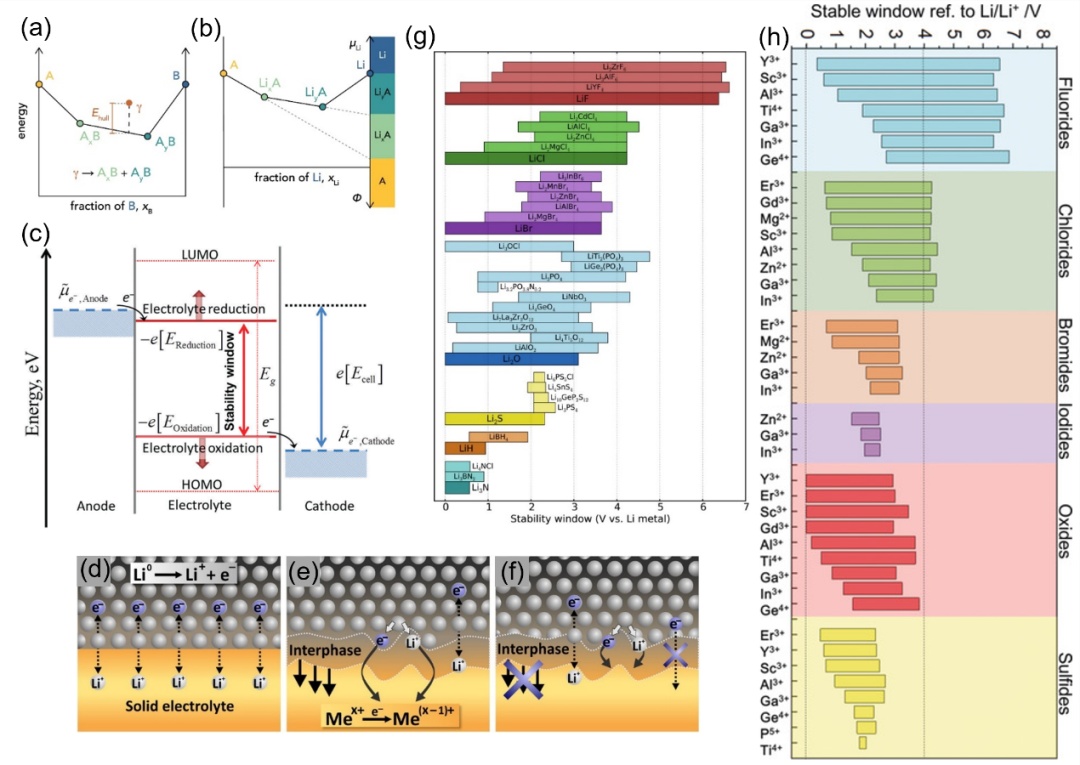 圖3.(a)顯示元素A和B之間相穩(wěn)定性的巨電勢相圖;(b)揭示A在不同Li化學勢下穩(wěn)定性的巨電勢相圖;(a-b)經(jīng)許可復制。[99]版權(quán)所有2018,ElsevierInc.(c)陽極鋰化學勢高于電解質(zhì)還原極限導致電解質(zhì)的鋰化和還原,陰極鋰化學勢低于電解質(zhì)氧化極限導致電解質(zhì)的脫鋰和氧化;經(jīng)許可復制,版權(quán)2018,RoyalSocietyofChemistry。(d)不發(fā)生SE分解的理想SE/Li界面有助于快速鋰離子傳輸;(e)SE分解形成的混合導電界面導致界面處持續(xù)SE分解;(f)具有低Li離子電導率的純Li離子導電界面相阻礙Li離子傳輸?shù)种芐E進一步分解;(d-f)經(jīng)許可復制,版權(quán)所有2015,ElsevierB.V.(g)理論計算各種SE的電化學穩(wěn)定性窗口;經(jīng)許可復制,版權(quán)所有2015,AmericanChemicalSociety。(h)理論計算具有不同陽離子的各種SE的電化學穩(wěn)定性窗口。經(jīng)許可復制,版權(quán)所有2019,Wiley¬CHVerlagGmbH&Co.KGaA,Weinheim
