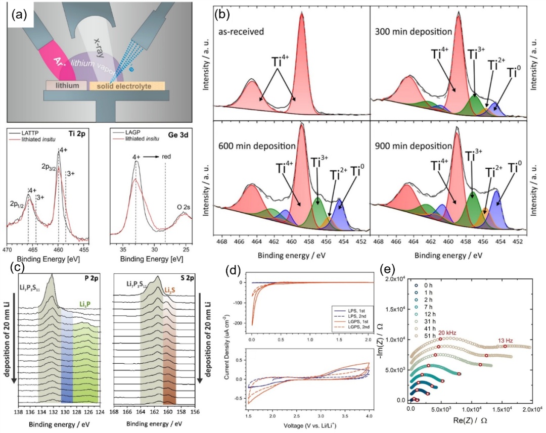 圖4.(a)NASICON型SE的原位XPS裝置和Ti2p和Ge3d的光譜示意圖;經(jīng)許可復制,版權(quán)所有2013,AmericanChemicalSociety。(b)原位XPS光譜顯示,在不同Li沉積時間,LLTO中Ti的還原;經(jīng)許可復制,版權(quán)所有2015,ElsevierB.V.(c)P2p和S2p原位XPS光譜顯示Li7P3S11的還原以及鋰化后Li3P和Li2S的形成;經(jīng)許可復制,版權(quán)2015,ElsevierB.V.(d)循環(huán)伏安法表明,LGPS在第一和第二個循環(huán)中分解,而LPS由于鈍化層的形成而在第二個周期中達到穩(wěn)定;經(jīng)許可復制,版權(quán)所有2014,Elsevier。(e)時間分辨阻抗譜顯示,由于Li3InCl6在Li陽極側(cè)的連續(xù)還原,對稱Li/Li3InCl6/Li電池的界面電阻隨著時間的增加而增加,光譜疊加有1k的位移且沒有重新縮放。經(jīng)許可復制,版權(quán)所有2020,LuiseM.Riegger,etal.AngewandteChemie,WileyVCHGmbH。