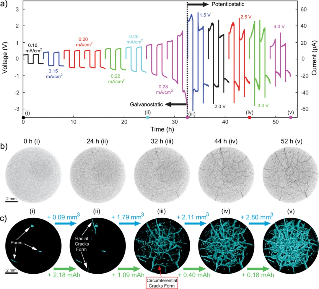 圖5.(a)Li/LAGP/Li對稱電池在不同電流密度下的恒電流充電/放電和不同電壓下的恒電位充電/放電下的電化學性能;(b)SE顆粒中心的X射線CT掃描顯示,隨著電化學循環(huán)時間的增加,裂紋逐漸增多;(c)3D斷層圖顯示了在與(b)中相同的電化學循環(huán)時間下3D裂紋網(wǎng)絡的變化。經(jīng)許可復制,版權(quán)所有2019,AmericanChemicalSociety。