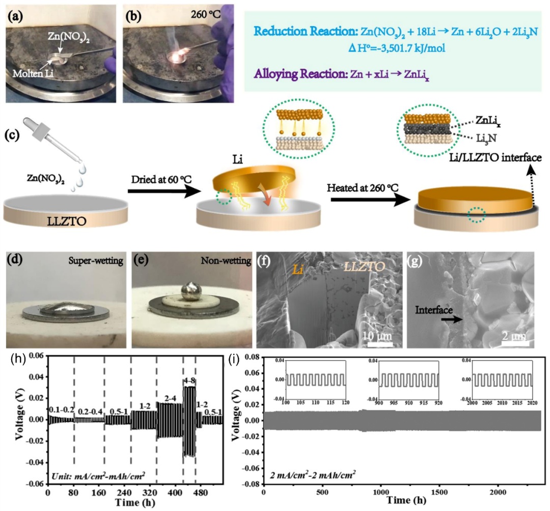 圖6.(a)熔融鋰上沉積Zn(NO3)2;(b)Zn(NO3)2與Li在260℃反應;(c)示意性示出了在Li和LLZO型SE之間制備ZnLix/Li3N基界面層的過程;(d)熔融鋰對含有ZnLix/Li3N涂層的LLZO的浸潤性;(e)熔融鋰對LLZO的潤濕性;(f)SEM顯示Li和ZnLix/Li3N涂覆的LLZO片之間的緊密接觸;(g)(f)中界面周圍的放大視圖;(h)鋰對稱電池在不同電流密度恒電流充/放電下的電化學性能;(i)鋰對稱電池在2mAcm-2恒電流充電/放電下的循環(huán)性能。經(jīng)許可復制,版權(quán)2020,WileyVCHVerlagGmbH&Co.KGaA,Weinheim。