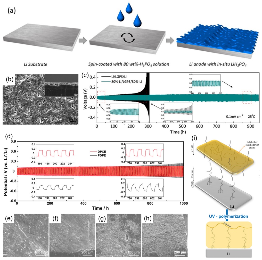 圖7.(a)示意圖顯示了通過旋涂在Li表面上沉積LiH2PO4的過程;(b)SEM顯示了80wt%-H3PO4涂覆的Li的表面形態(tài)和界面;(c)在0.1mAcm-2的恒電流充電/放電下,使用LiH2PO4保護層前后鋰對稱電池的循環(huán)性能;(a-c)經(jīng)許可復制,版權(quán)2018,AmericanChemicalSociety。(d)使用PAN/LATP/PEO(DPCE)和PAN/PEO(PDPE)SE的Li對稱電池在恒電流充電/放電下的循環(huán)性能;PAN/LAP/PEOLi陽極的(e)頂視圖和(f)側(cè)視圖的SEM;(g)PAN/PEOLi陽極的頂視圖和(h)側(cè)視圖;(d-h)經(jīng)許可復制,版權(quán)2019,AmericanChemicalSociety。(i)示意圖顯示了通過UV輔助聚合增強的PEO/Li金屬界面。經(jīng)許可復制,版權(quán)所有2019KarimZaghibetal.,WileyVCHVerlagGmbH&Co.KGaA。