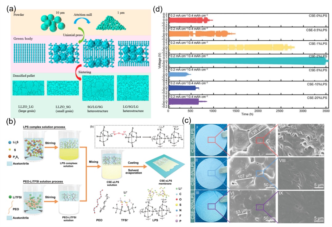 圖8.(a)顯示了制造具有不同晶粒尺寸的LLZO的程序示意圖;經(jīng)許可復制,版權(quán)所有2015,AmericanChemicalSociety。(b)生產(chǎn)LPS–PEO–LiTFSI復合固體電解質(zhì)(CSE)膜的實驗程序示意圖;(c)顯示LPS–PEO–LiTFSI復合固體電解質(zhì)膜表面形態(tài)的光學和SEM圖像;(d)使用LPS–PEO–LiTFSI復合固體電解質(zhì)膜(具有不同LPS含量)在0.2mAcm-2恒電流充電/放電下的Li對稱電池的循環(huán)性能。(b-d)經(jīng)許可復制,版權(quán)所有2022,WileyVCHGmbH。