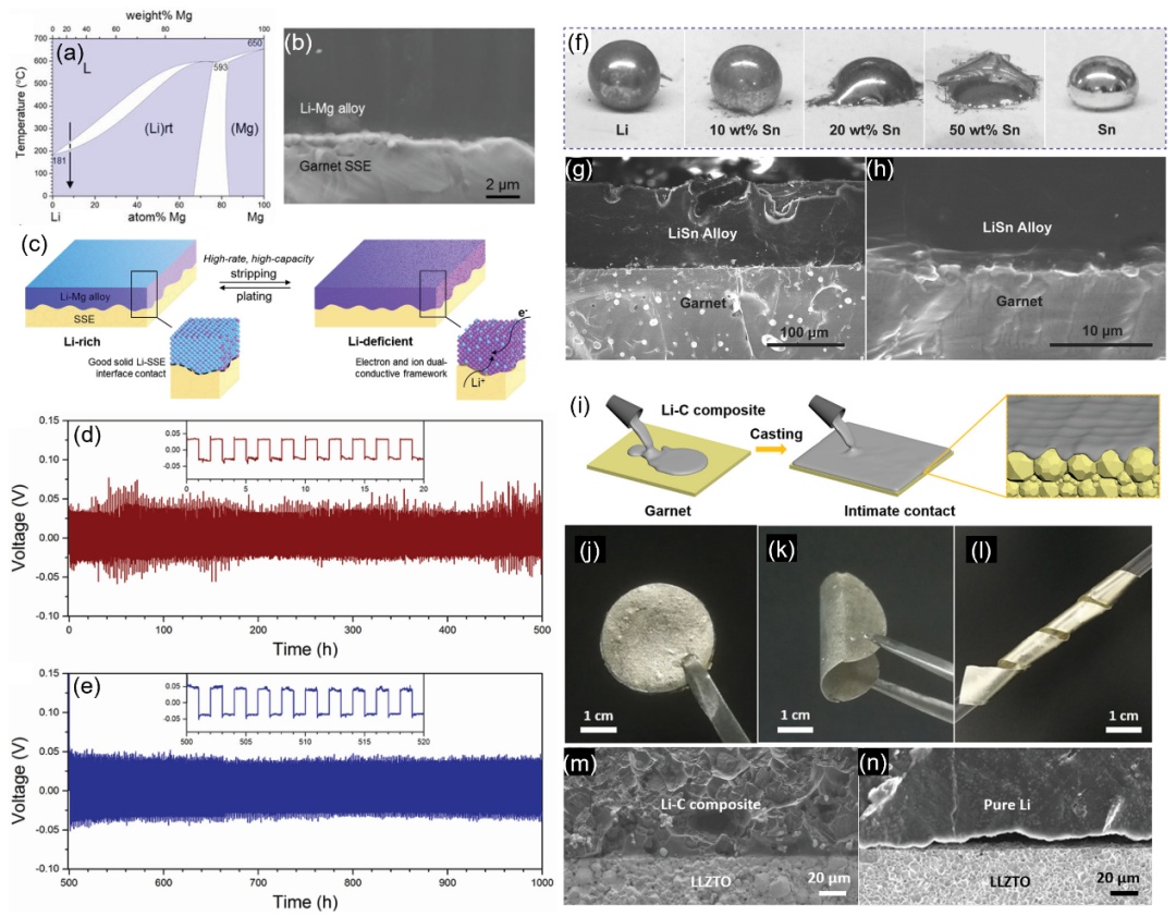 圖9.(a)Li-Mg合金的相圖;(b)SEM圖像顯示了Li-Mg合金和石榴石SE之間的緊密接觸;(c)示意圖顯示了在Li沉積/剝離之后在Li-Mg/石榴石SE界面處保持緊密接觸;Li-Mg/Ta摻雜LLZO/Li-Mg對稱電池在(d)1mAcm-2和(e)2mAcm-2恒電流充放電下的循環(huán)性能;(a-e)經(jīng)許可復制,版權(quán)2018,WILEY-VCHVerlagGmbH&Co.KGaA,Weinheim。(f)不同Sn含量的熔融Li-Sn合金對LLZO型SE的潤濕性;(g-h)顯示Li-Sn和LLZO型SE之間緊密接觸的SEM圖像;(f-h)經(jīng)許可復制,版權(quán)所有2017,WILEY-VCHVerlagGmbH&Co.KGaA,Weinheim。(i)示意圖顯示了鋰-石墨復合材料對摻雜Ta的LLZO的高潤濕性;(j-l)顯示鋰-石墨復合材料的高柔性的光學圖像;SEM圖像顯示(m)Li石墨復合物/(n)純Li和摻雜Ta的LLZO之間的接觸。(i-n)經(jīng)許可復制,版權(quán)所有2019,WILEY-VCHVerlagGmbH&Co.KGaA,Weinheim。