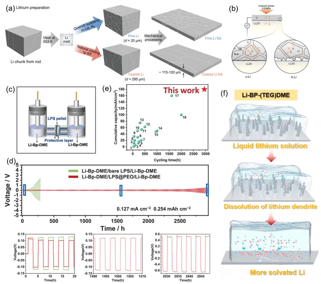 圖10.(a)示意圖顯示了制造具有不同晶粒尺寸的Li箔的程序;(b)顯示晶粒尺寸對Li蠕變影響的示意圖;(a-b)經(jīng)許可復制,版權(quán)2022,Janeketal.,WileyVCHGmbH。(c)示意圖顯示了用于Li-Bp-DME液體溶液陽極的自制電池;(d)Li-Bp-DME對稱電池在0.127mAcm-2恒電流充放電下的循環(huán)性能;(e)Li-Bp-DME與其他液體溶液陽極的性能比較;(c-e)經(jīng)許可復制,版權(quán)所有2021,Wiley-VCHGmbH.(f)示意圖顯示了Li-Bp-DME在溶解鋰枝晶中的作用。經(jīng)許可復制,版權(quán)所有2022,ElsevierB.V.。