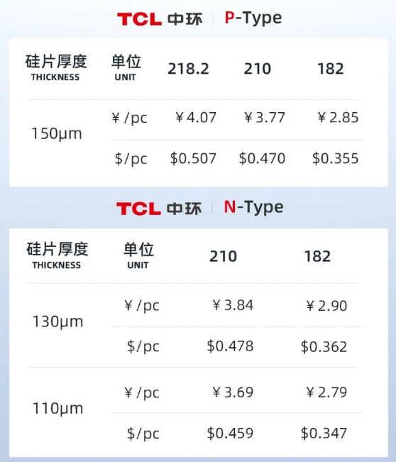 N型130μm210、182的價格分別為3.84元、2.90元,相較6月1日的5.45元、3.87元,分別下降29.54%、25.06%。N型110μm210、182的價格分別為3.69元、2.79元,相較6月1日的5.23元、3.72元,分別下降29.45%、25%。