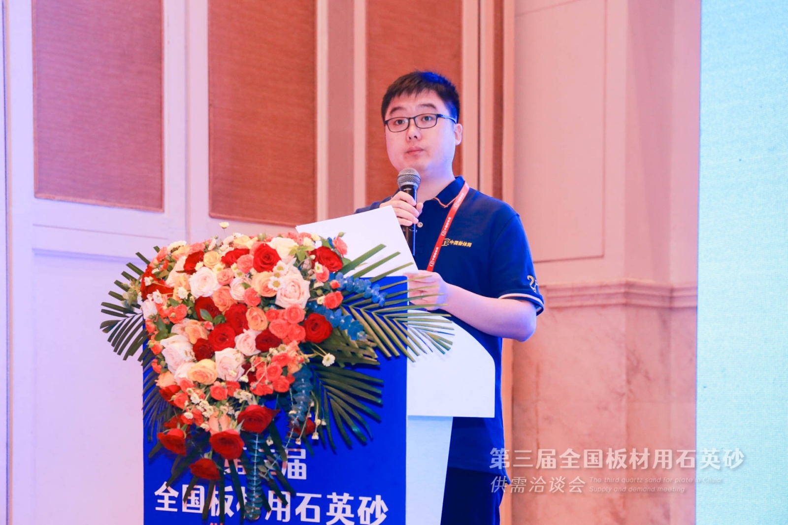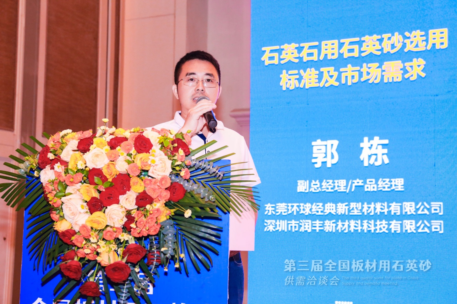 東莞環(huán)球經(jīng)典新型材料有限公司&深圳市潤豐新材料科技有限公司的副總經(jīng)理/產(chǎn)品經(jīng)理郭棟作《石英石用石英砂選用標(biāo)準(zhǔn)及市場需求》報(bào)告