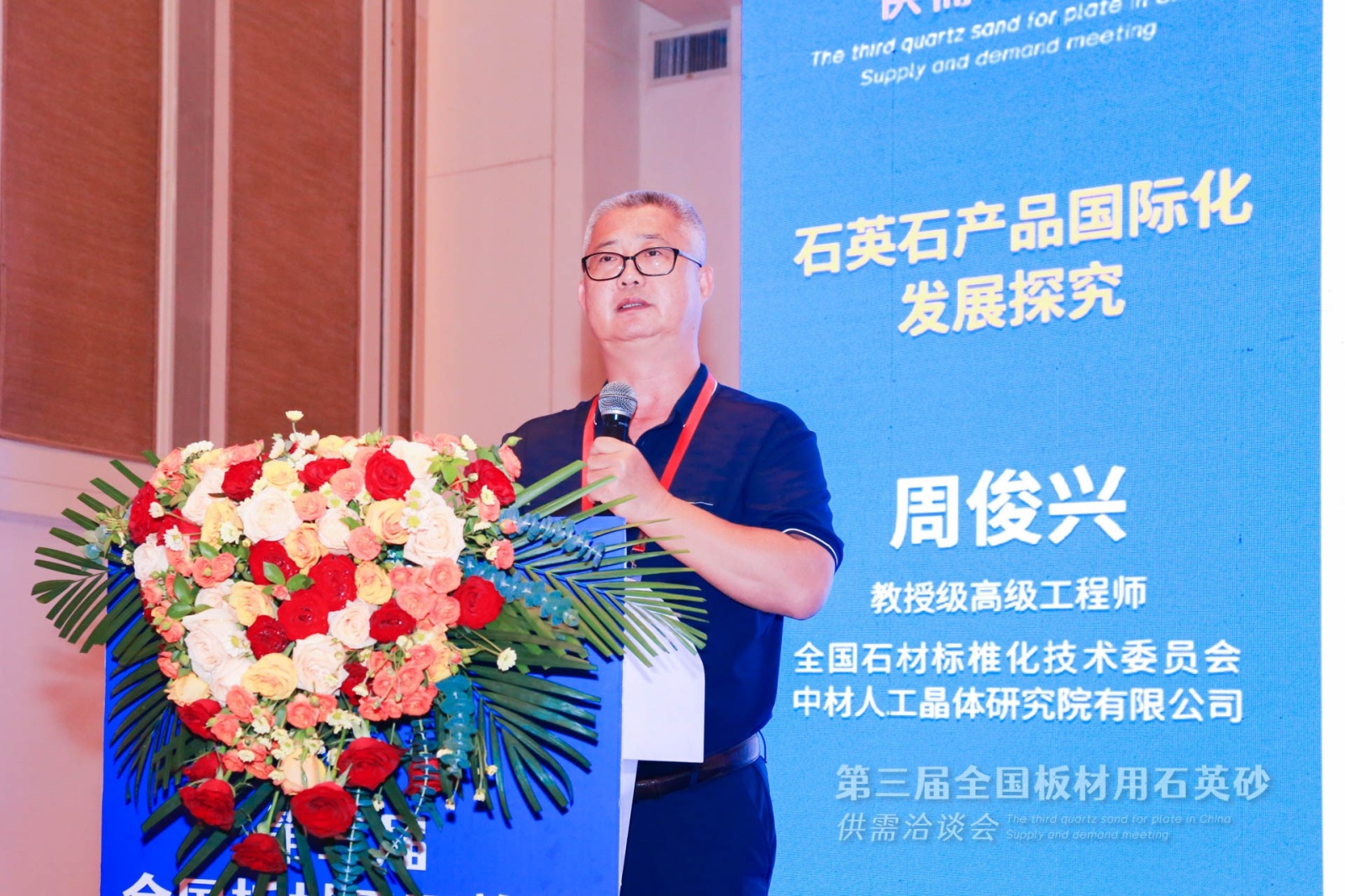 全國石材標(biāo)準(zhǔn)化技術(shù)委員會&中材人工晶體研究院有限公司的教授級高級工程師周俊興作《石英石產(chǎn)品國際化發(fā)展探究》報(bào)告