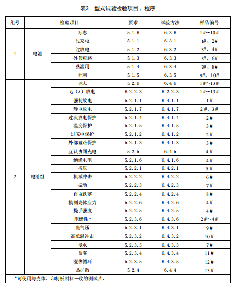 征求意見稿對(duì)各項(xiàng)要求的試驗(yàn)方法進(jìn)行了規(guī)范,包含試驗(yàn)條件、樣品準(zhǔn)備、電池安全測(cè)試、電池組安全測(cè)試。也對(duì)型式試驗(yàn)進(jìn)行了規(guī)范,包含檢驗(yàn)規(guī)定、檢驗(yàn)樣本和檢驗(yàn)程序、檢驗(yàn)判別。