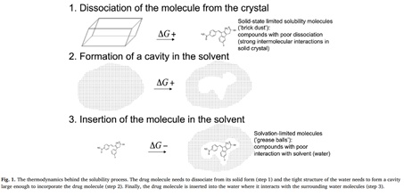 從上述化合物的溶解度過(guò)程,我們可以清楚的知道化合物的溶解度需要經(jīng)歷的三個(gè)過(guò)程:打破晶格能-空穴形成-化合物分子水化,一般認(rèn)為溶解度的第一步和第三步所需要的能量較大,通常作為溶解的限速步驟,同時(shí)第一步的影響更加的大。那么,當(dāng)我們拿到一個(gè)化合物分子去執(zhí)行溶解度測(cè)試時(shí),發(fā)現(xiàn)化合物溶解度較低,我們需要格外注意以下結(jié)論:①粉碎或者微粉不可以提高化合物的溶解度,除非在粉碎或者微粉過(guò)程中,化合物出現(xiàn)的物理穩(wěn)定性的變化,如轉(zhuǎn)晶,無(wú)定形化;②改變固體形態(tài)或化合物鏡下晶癖,也不影響化合物的溶解度,但是可能會(huì)對(duì)化合物的溶出速率造成影響,也可能會(huì)影響化合物的物理穩(wěn)定性,化學(xué)穩(wěn)定性以及機(jī)械性能,如流動(dòng)性、松密度和可壓性等。③化合物處于無(wú)定形狀態(tài),化合物分子間不具有相互作用,處于長(zhǎng)程無(wú)序狀態(tài),具有高能特性,分子晶格不再是化合物溶解度的限制因素,且化合物粒徑處于較小狀態(tài),甚至為分子級(jí)別,添加親水性聚合物穩(wěn)定化合物的無(wú)定形形式且保護(hù)分子在溶液中保持過(guò)飽和狀態(tài),同時(shí)這也提高了化合物分子的潤(rùn)濕性。對(duì)于熔點(diǎn)較高,晶格能限制化合物溶解度的藥物分子,無(wú)定形固體分散體或許是最好的選擇用來(lái)增溶的策略。但是,無(wú)定形的轉(zhuǎn)晶問(wèn)題需要深入研究,以保證制備的藥物能夠在貨架期保持穩(wěn)定性。高能態(tài)向低能態(tài)轉(zhuǎn)變的趨勢(shì)無(wú)法轉(zhuǎn)變,但是可以能過(guò)技術(shù)手段,延遲轉(zhuǎn)變的時(shí)間。④對(duì)于由于化合物分子親脂性較強(qiáng),化合物溶解度過(guò)程,親脂性限制化合物溶解,貿(mào)然使用固體分散體技術(shù)增溶,或許不是最佳手段。通過(guò)在處方中添加脂質(zhì)成分,包裹化合物分子,進(jìn)而透過(guò)胞吞方式提高化合物的生物利用度,或許是最佳手段;⑤化合物的分子量大于500,認(rèn)為已經(jīng)過(guò)大,其為化合物成藥性5規(guī)則限制條件之一。據(jù)有關(guān)報(bào)道,化合物的分子量越大,臨床試驗(yàn)越是往后失敗的機(jī)率越大。亦有說(shuō)法,盡管化合物的成藥性多條不符合5規(guī)則,也可通過(guò)先進(jìn)高端的制劑手段予以解決,只是難度之大,困難之多,僅此而已。