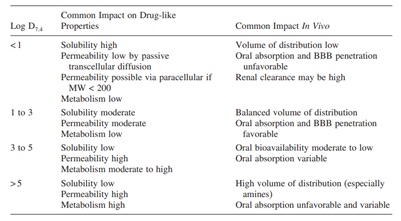 化合物水化能力強(qiáng)弱的參數(shù)為L(zhǎng)ogP,即油水分配系數(shù),描述化合物在正辛醇與水之間的分配平衡。因?yàn)樗幬锓肿咏Y(jié)構(gòu)比較復(fù)雜,多同時(shí)具有親水疏水基團(tuán),這樣化合物分子可能具有兩親性,對(duì)于LogP較大的化合物分子,疏水性越強(qiáng),親水性越差,LogP較低的藥物,反之。下表給出了化合物L(fēng)ogP的范圍對(duì)于藥物溶解度以及體內(nèi)行為的影響。
