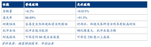光伏玻璃構(gòu)成光伏組件最外層結(jié)構(gòu),起到透光與保護(hù)的作用。光伏玻璃在保證較高透光率的同時(shí),保護(hù)機(jī)械強(qiáng)度較差的電池片以及易于氧化生銹的電極,可以起到延長(zhǎng)組件使用壽命以及提高電池組件光電轉(zhuǎn)換效率的作用。相較于普通玻璃,光伏玻璃具有含鐵量低、透光率高、抗沖擊、耐腐蝕、耐高溫等特征。