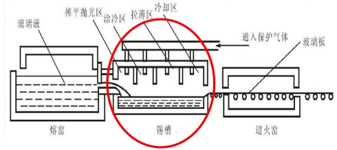 浮法是將熔融玻璃從池窯中連續(xù)流入并漂浮在相對(duì)密度大的錫液表面上,在重力和表面張力的作用下,使玻璃液在錫液面上鋪開(kāi)、攤平,經(jīng)退火、切裁得到浮法原片玻璃。