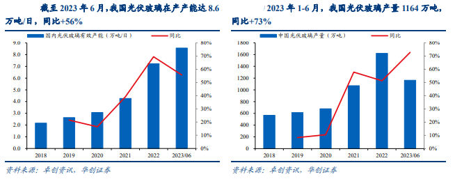 2022年,我國(guó)光伏玻璃產(chǎn)量約占全球產(chǎn)量的90%。據(jù)卓創(chuàng)資訊數(shù)據(jù),2022年我國(guó)光伏玻璃新增在產(chǎn)產(chǎn)能約3.0萬(wàn)噸/日,同比增長(zhǎng)147%。2022年底我國(guó)光伏玻璃在產(chǎn)產(chǎn)能達(dá)7.2萬(wàn)噸/日,同比增長(zhǎng)70%;截至2023年6月我國(guó)光伏玻璃在產(chǎn)產(chǎn)能8.6萬(wàn)噸/日,同比增長(zhǎng)56%。產(chǎn)出方面,2022年我國(guó)光伏玻璃產(chǎn)量1621萬(wàn)噸(折合日產(chǎn)量4.4萬(wàn)噸/日),同比增長(zhǎng)51%。2022年全球新增光伏裝機(jī)240GW,同比增長(zhǎng)37%,我國(guó)光伏玻璃產(chǎn)能及產(chǎn)量增速均高于光伏裝機(jī)增速。