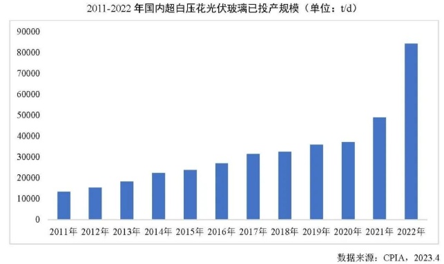 截止2022年12月底,光伏壓延玻璃在產(chǎn)企業(yè)共37家,剔除無(wú)效產(chǎn)能,現(xiàn)有已投產(chǎn)產(chǎn)能128座窯442條線,總產(chǎn)能約為84299t/d。其中:在產(chǎn)窯爐產(chǎn)能約為79389t/d,同比增長(zhǎng)84.4%;產(chǎn)能利用率為94.1%,較2021年進(jìn)一步提高。2022年1-12月,國(guó)內(nèi)超白壓延光伏玻璃產(chǎn)量約1606.2萬(wàn)噸,同比增長(zhǎng)53.6%。