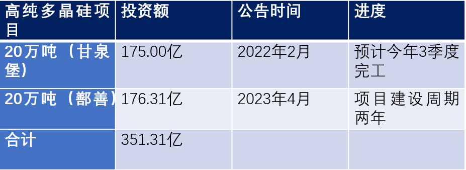 2023年4月,又推出年產(chǎn)20萬噸高純晶硅項(xiàng)目(鄯善),投資規(guī)模為176.31億元;項(xiàng)目建設(shè)周期兩年。