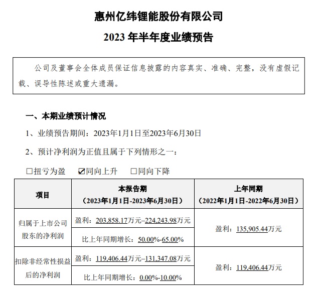 中國(guó)粉體網(wǎng)訊 8月3日,億緯鋰能發(fā)布2023年半年度業(yè)績(jī)預(yù)告,預(yù)計(jì)上半年公司實(shí)現(xiàn)凈利潤(rùn)20.39億元至22.42億元,同比增長(zhǎng)50%至65%。預(yù)計(jì)實(shí)現(xiàn)扣非凈利潤(rùn)11.94億元至13.13億元,同比增長(zhǎng)0%至10%。