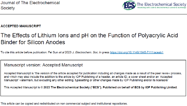 該研究以“The Effects of Lithium Ions and pH on the Function of Polyacrylic Acid Binder for Silicon Anodes”為題發(fā)表在國際頂級(jí)期刊Journal of the Electrochemical Society上,F(xiàn)ei Sun為本文的第一作者。