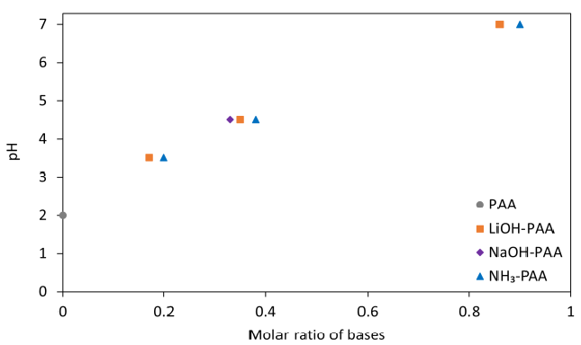 圖1. 堿與PAA單體的摩爾比對(duì)所得粘合劑溶液pH的影響。