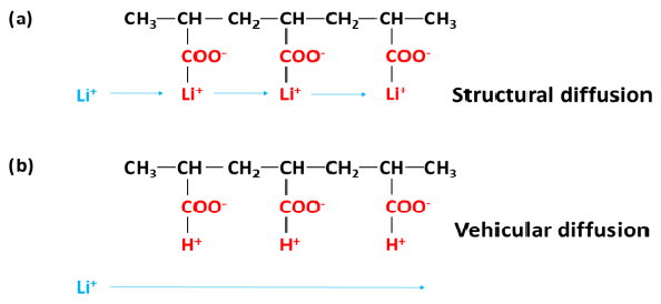 圖2. PAA粘合劑中Li+不同傳輸機(jī)制的示意圖。
