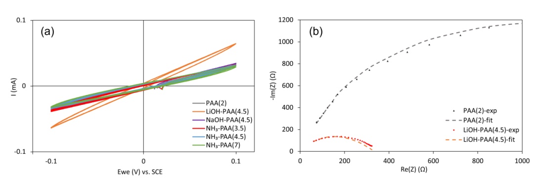 圖3. 粘結(jié)劑膜的(a)CV測試和(b)EIS測試,實(shí)驗(yàn)數(shù)據(jù)以點(diǎn)表示,建模擬合以虛線表示。