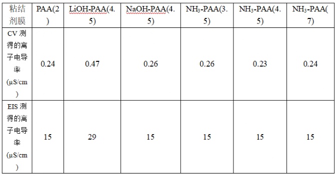 表1.通過CV和EIS測試計(jì)算出粘合劑膜的離子電導(dǎo)率。
