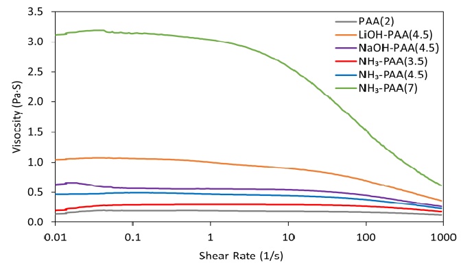 圖4. 在不同剪切速率下的PAA、LiOH-PAA和NH3-PAA粘合劑溶液的粘度。