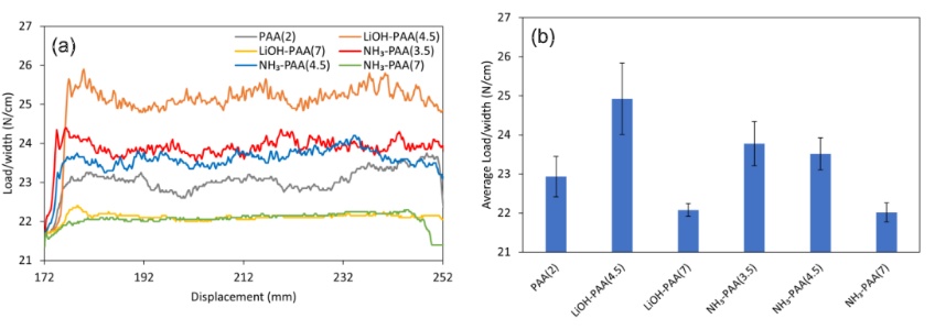 圖5.使用不同粘合劑制造的硅負(fù)極的剝離測試結(jié)果:(a)每單位寬度的負(fù)載與位移的關(guān)系,以及(b)相應(yīng)的平均值。