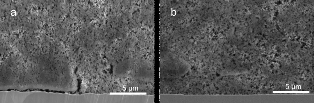 圖6. (a)使用NH3-PAA(7)粘結(jié)劑發(fā)生電極分層現(xiàn)象的負(fù)極和(b)使用NH3-PAA(3.5)粘結(jié)劑連接良好的負(fù)極的代表性橫截面圖像。