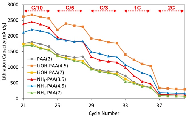圖7. 在不同充放電倍率下,使用不同粘結(jié)劑的硅半電池的平均容量對(duì)比圖(循環(huán)次數(shù)為21-40,每種粘結(jié)劑劑的兩個(gè)樣品的平均標(biāo)準(zhǔn)誤差為34 mAh/g)。