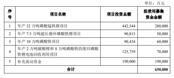 中國(guó)粉體網(wǎng)訊 8月11日,湖南裕能發(fā)布了向特定對(duì)象發(fā)行股票預(yù)案,本次發(fā)行募集資金總額不超過(guò)650,000萬(wàn)元,扣除發(fā)行費(fèi)用后擬全部用于年產(chǎn)32萬(wàn)噸磷酸錳鐵鋰項(xiàng)目、年產(chǎn)7.5萬(wàn)噸超長(zhǎng)循環(huán)磷酸鐵鋰項(xiàng)目、年產(chǎn)10萬(wàn)噸磷酸鐵項(xiàng)目、年產(chǎn)2萬(wàn)噸碳酸鋰和8萬(wàn)噸磷酸鐵的廢舊磷酸鐵鋰電池回收利用項(xiàng)目、補(bǔ)充流動(dòng)資金。