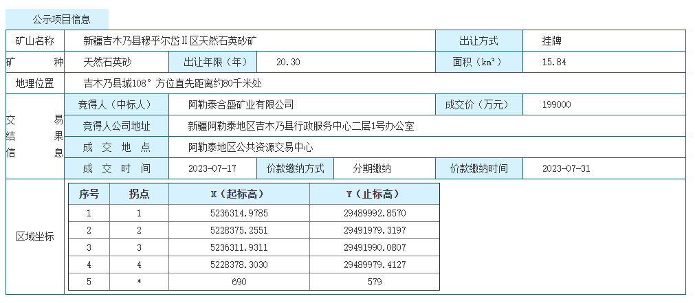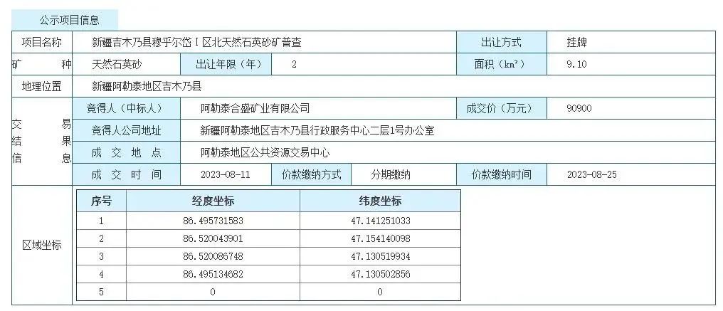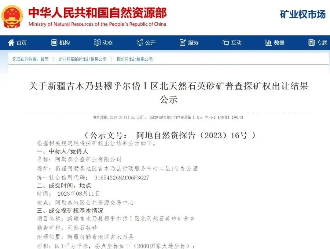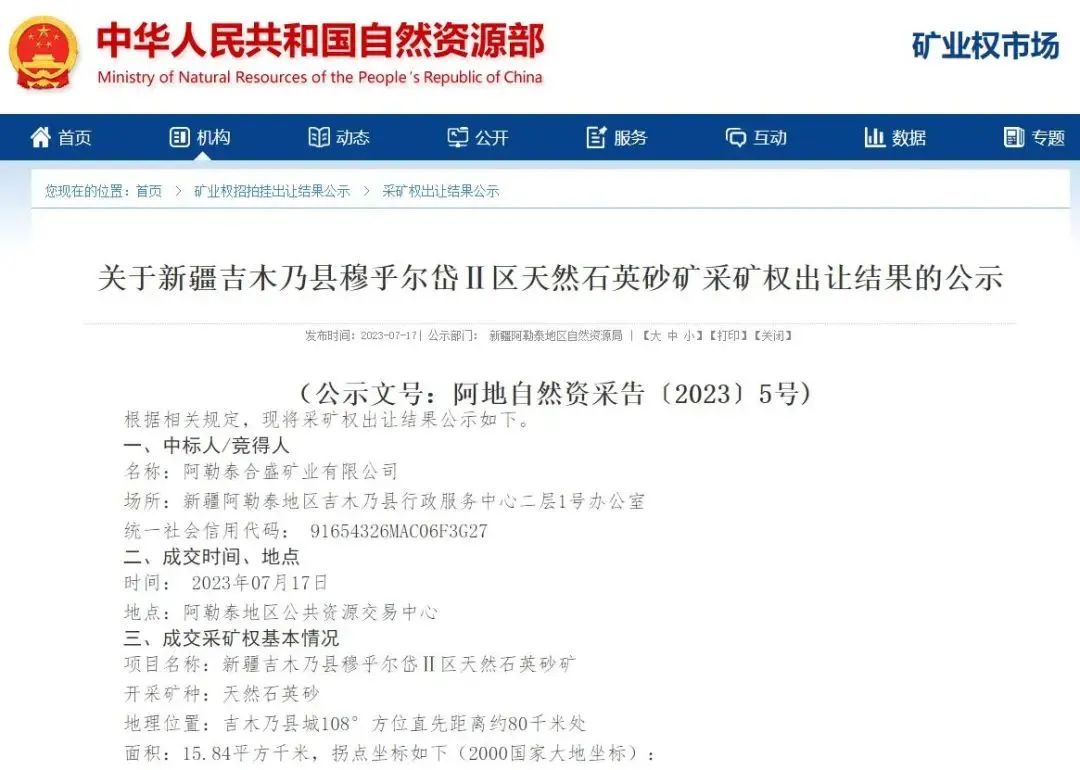 在此之前,2023年7月17日阿勒泰合盛礦業(yè)有限公司以19.9億元競得“新疆吉木乃縣穆乎爾岱Ⅱ區(qū)天然石英砂礦”,該天然石英砂采礦權(quán)掛牌起始價(jià)為7.3億元,采礦權(quán)面積15.84平方千米,推斷天然石英砂資源量5846.40萬噸,擬出讓年限20.3年,最終以19.9億元成交。