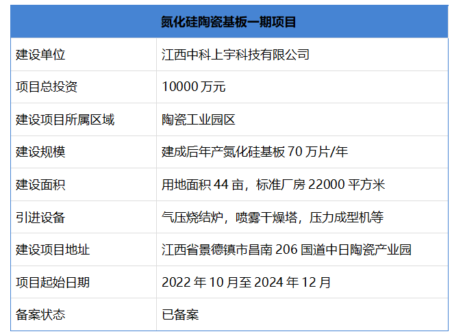 年產(chǎn)70萬片!江西中科上宇氮化硅陶瓷基板項(xiàng)目備案通過