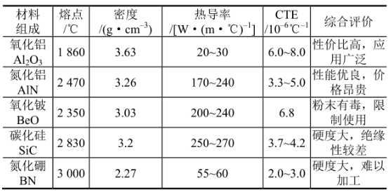 氮化鋁陶瓷的各項性能優(yōu)異,尤其是高熱導率的特點,其理論熱導率可達320W/(m·K),其商用產(chǎn)品熱導率一般為180W/(m·K)~260W/(m·K),使其能夠用于高功率、高引線和大尺寸芯片封裝基板材料。