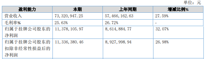 2023年上半年公司實(shí)現(xiàn)營業(yè)收入73,320,947.25元,比上年同期增長27.59%;歸屬于掛牌公司股東的凈利潤11,378,105.97元,比上年同期增長32.07%;歸屬于掛牌公司股東的扣除非經(jīng)常性損益后的凈利潤11,336,380.46元,比上年同期增長26.98%。