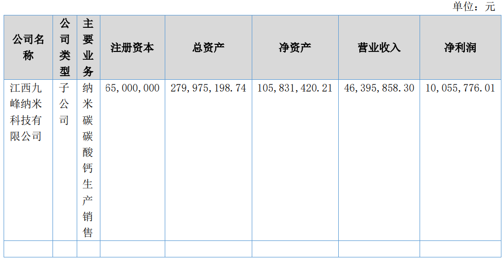 (1)浙江天一新材料有限公司:注冊資本500萬元,公司持股比例100%,主營業(yè)務(wù)為無機(jī)鹽類新材料、有機(jī)化學(xué)新材料的銷售及機(jī)關(guān)技術(shù)咨詢服務(wù);人力資源裝卸搬運(yùn);納米鈣預(yù)聚體的生產(chǎn)及銷售。本期凈利潤為8.84萬元。