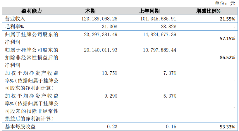 2023年上半年公司實(shí)現(xiàn)營業(yè)收入12,318.91萬元,比上年同期增長21.55%;歸屬于掛牌公司股東的凈利潤23,297,381.49元,比上年同期增長57.15%;歸屬于掛牌公司股東的扣除非經(jīng)常性損益后的凈利潤20,140,011.93元,比上年同期增長86.52%。