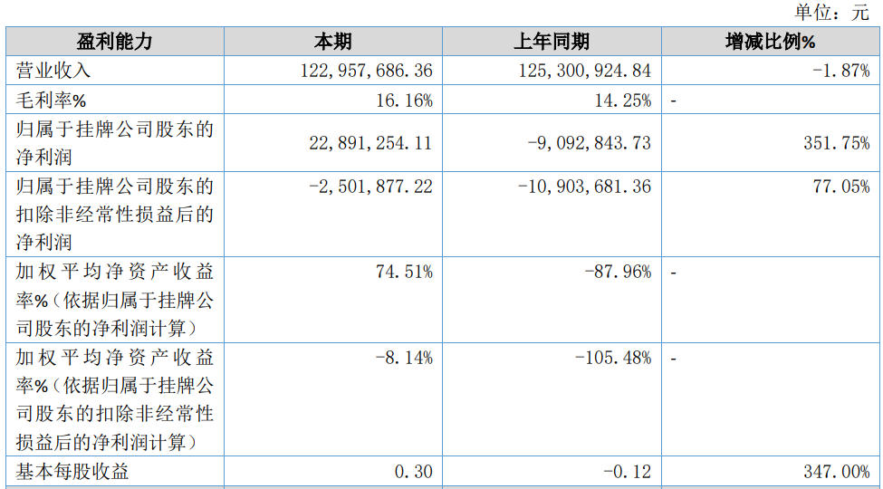2023年上半年公司實(shí)現(xiàn)營業(yè)收入122,957,686.36元,比上年同期減少1.87%;歸屬于掛牌公司股東的凈利潤22,891,254.11元,比上年同期增長351.75%;歸屬于掛牌公司股東的扣除非經(jīng)常性損益后的凈利潤-2,501,877.22元,比上年同期增長77.05%。