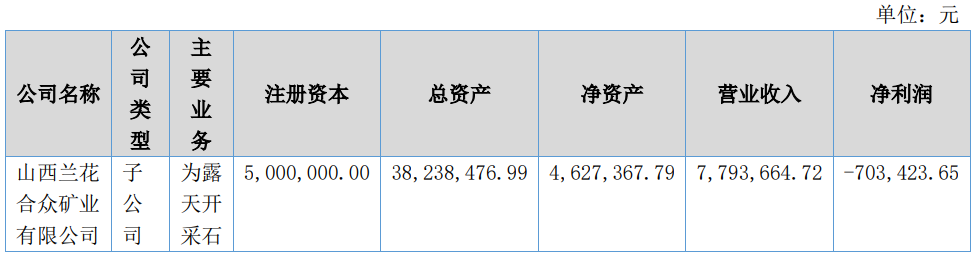 負(fù)責(zé)露天開采石業(yè)務(wù)的山西蘭花合眾礦業(yè)有限公司,本期實(shí)現(xiàn)營業(yè)收入7,793,664.72元,凈利潤-703,423.65元。