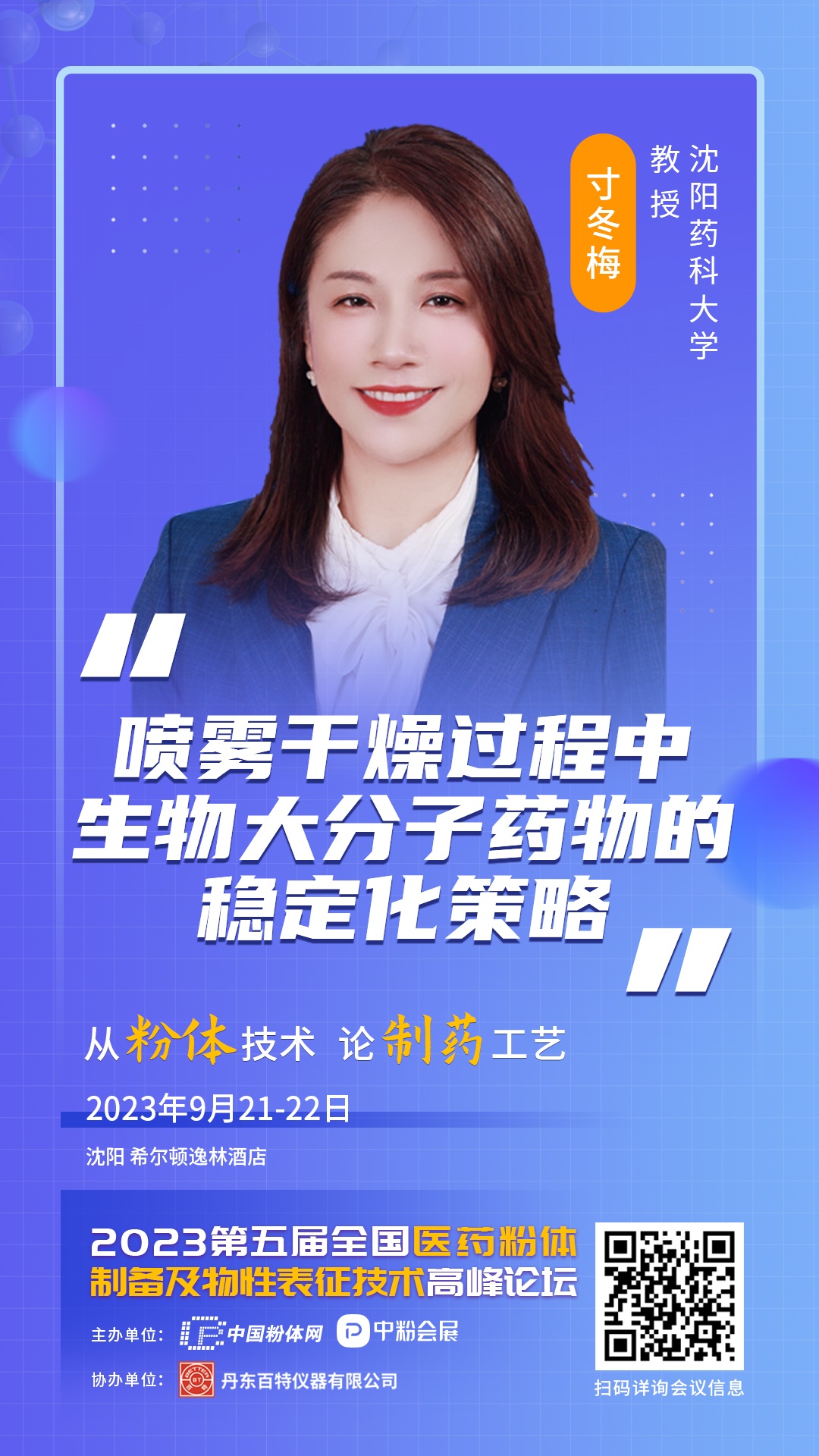 2023年9月21-22日,中國粉體網(wǎng)以“從粉體技術(shù),論制藥工藝”為主題,將在遼寧沈陽希爾頓逸林酒店舉辦“第五屆全國醫(yī)藥粉體制備及物性表征技術(shù)高峰論壇”,此次會議有幸邀請到來自沈陽藥科大學的寸冬梅教授為我們帶來題為《噴霧干燥過程中生物大分子藥物的穩(wěn)定化策略》報告,報告主講人在報告中將分別針對蛋白質(zhì)、抗體、核酸等不同的生物大分子藥物類型,通過一些案例分別從理論層面和實驗層面對穩(wěn)定化策略進行探討。