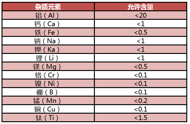 光伏用高純石英砂各雜質(zhì)元素含量要求(單位:微克每克)