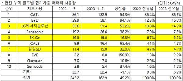 韓國(guó)三家公司的市場(chǎng)占有率為23.5%,比去年同期下降1.7個(gè)百分點(diǎn),但三家公司的電池裝車量均呈現(xiàn)增長(zhǎng)趨勢(shì)。LG新能源電池裝車量為51.4GWh,同比增長(zhǎng)53.2%,居第三,SK on電池裝車量19.0GWh,同比增長(zhǎng)16.3%,三星SDI電池裝車量為15.0GWh,同比增長(zhǎng)32.0%,分別位居第五和第七。