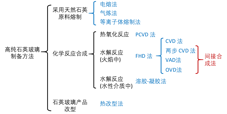 工業(yè)中常見的直接合成法為化學(xué)氣相沉積法(CVD),間接合成法包括在CVD法基礎(chǔ)上改良的兩步CVD法、氣相軸向沉積法(VAD)及管外氣相沉積法(OVD)等。