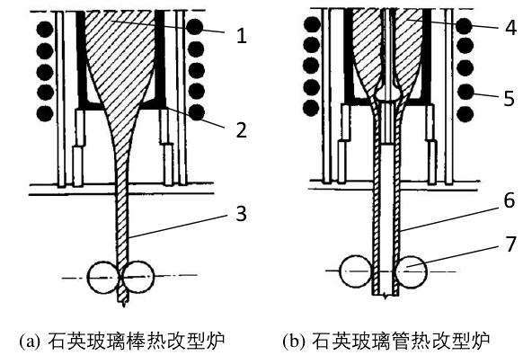 (圖中部件:1-石英玻璃母棒;2-發(fā)熱體;3-石英玻璃棒;4-石英玻璃母管;5-感應(yīng)線圈;6-石英玻璃管;7-牽引器)