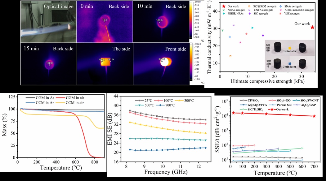 在此基礎上,團隊結合向心冷凍鑄造及化學氣相沉積技術,形成內(nèi)凹取向結構和“BN/石墨烯/BN”三明治片層,獲得具有層次結構的陶瓷基復合材料,實現(xiàn)優(yōu)異的抗壓縮性能,具有負泊松比和高比強雙重超材料屬性。依賴于陶瓷組分的保護作用,該材料具有高效的隔熱性能,高溫下具有良好的電磁干擾屏蔽性能。在700℃時,比屏蔽效率(SSE/t)可達9416 dB·cm2·g-1。
