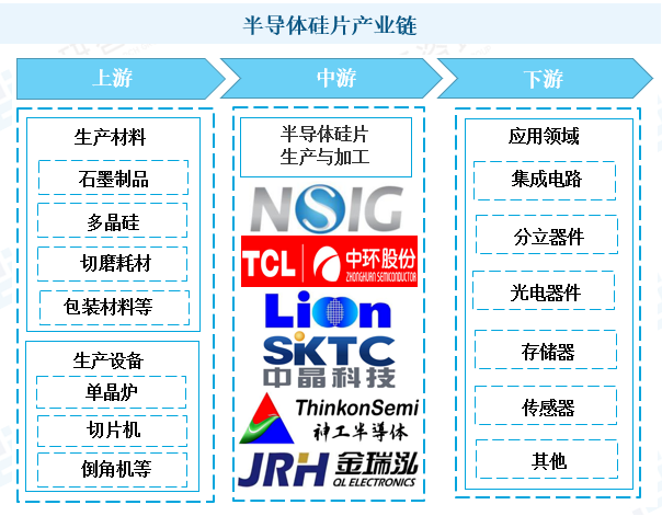 我國半導(dǎo)體硅片產(chǎn)業(yè)鏈涉及電子級多晶硅制造、半導(dǎo)體硅片制造、半導(dǎo)體器件制造等環(huán)節(jié)。其中,上游半導(dǎo)體硅片原料電子級多晶硅主要依賴進(jìn)口,僅有少有的幾家公司能夠批量生產(chǎn)。